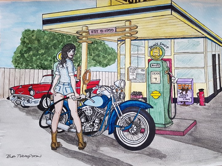 These artworks are inspired by the two Davids, Uhl and Mann. My idols. Uhl is known for oil paintings of vintage Harley Davidson bikes. Mann (1940-2004) was known as “the biker world’s artist-in-residence.”