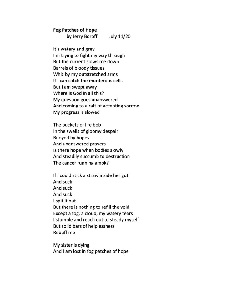 1. Wonderful work. Very thought and emotion provoking. Fog Patches of Hope is gut-wrenching. I sure can relate to those solid bars of helplessness meeting my touch as I stumble. Thanks for sharing in spite of the uncomfortable exposure. (can relate to that as well)
