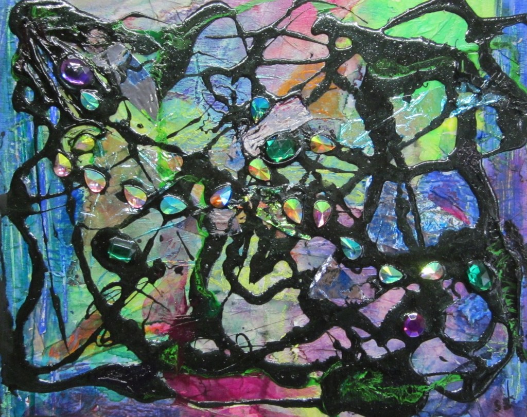 I began with colourful acrylic inks on bleeding tissue symbolizing the colours I feel in the music. I glued it onto the board, added a bit of crayon, then pasted on some iridescent wrapping paper here and there. Then I drizzled on some black tar gel  (for the night part) and added shiny things to symbolize sparkling city lights and the feel of a lively jazz club.