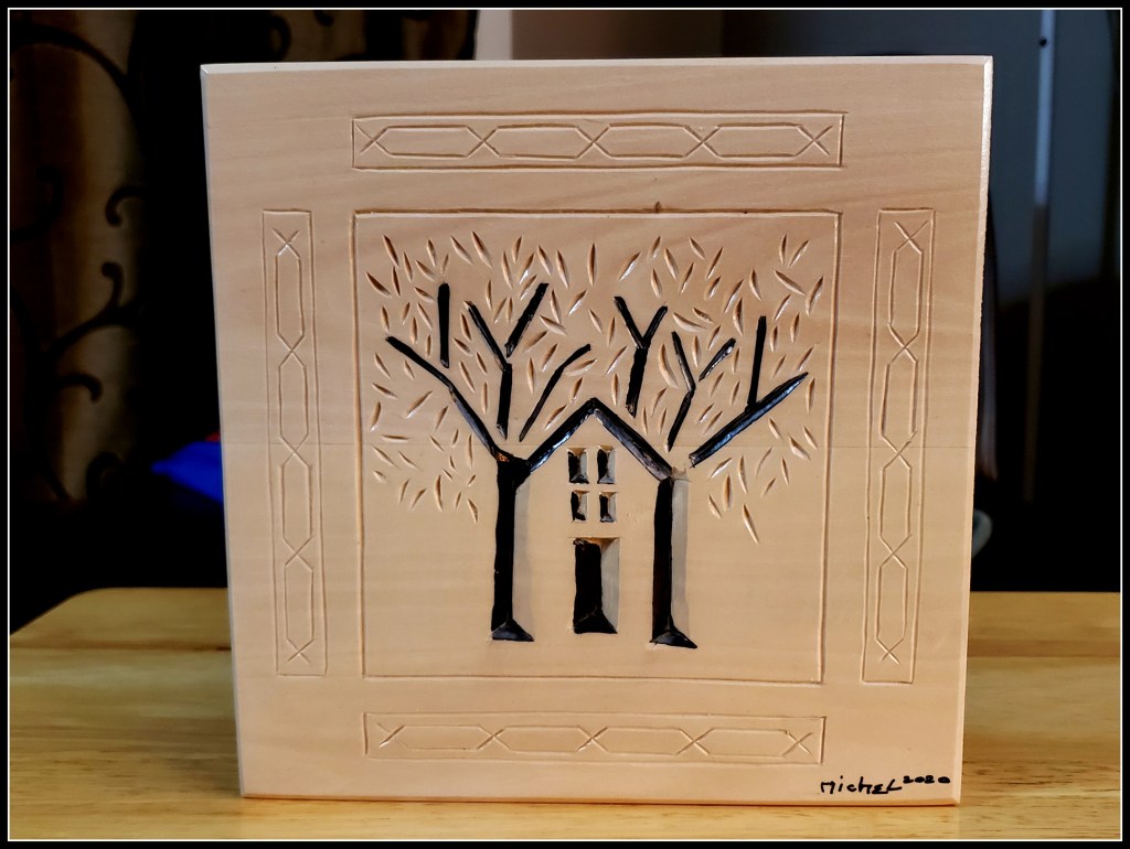 The piece is carved on basswood about 10″ x 10″ square and about 1 1/2′ deep. The technique used is called chip-carving which is much like shallow etching. Black acrylic paint was used to contrast/highlight the edges of the trees and house, and all surfaces were covered with several layers of protective varnish. The underside has small round feet at each corner so as not to mar the tabletop.