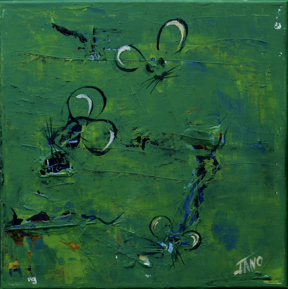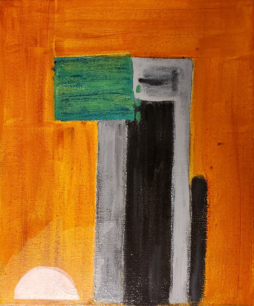 This painting began in 2018. I had had an ocular migraine and this image was left on my eyes for a long time afterwards. I had to go paint it while I could still see it.To me, it looked like a cubist cat. I didn’t do anything with it until this challenge. I looked at it again and thought, it needed a mouse!