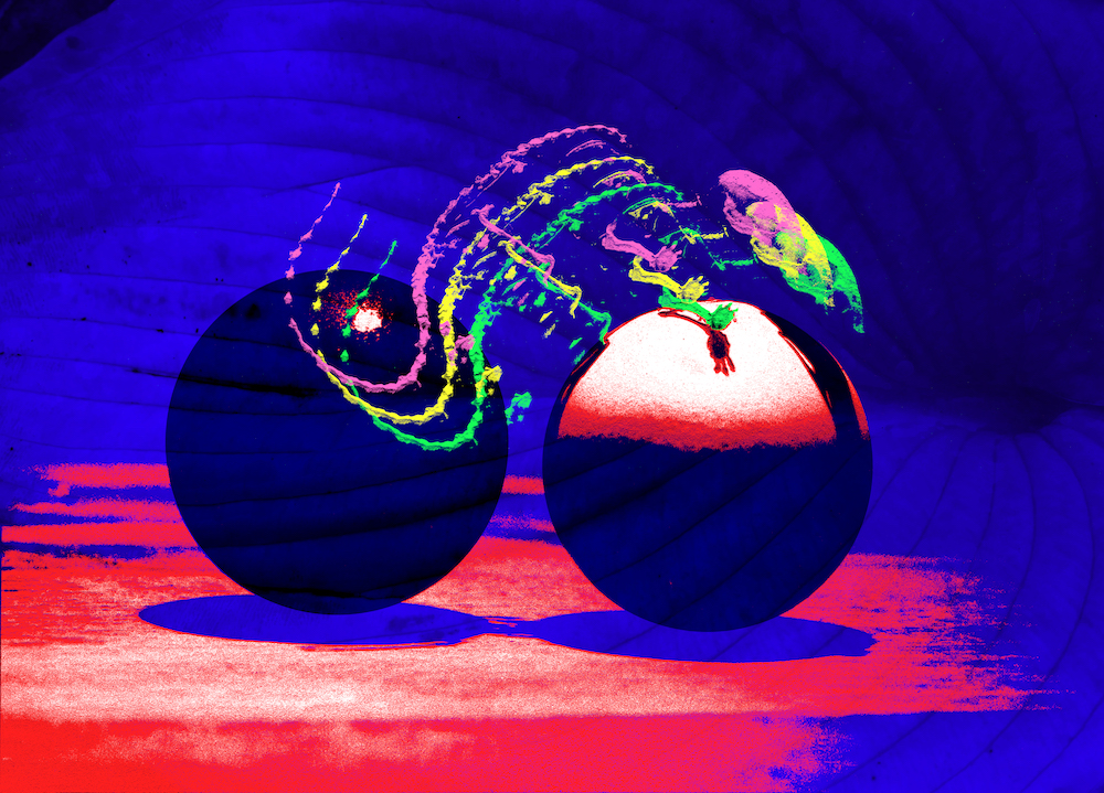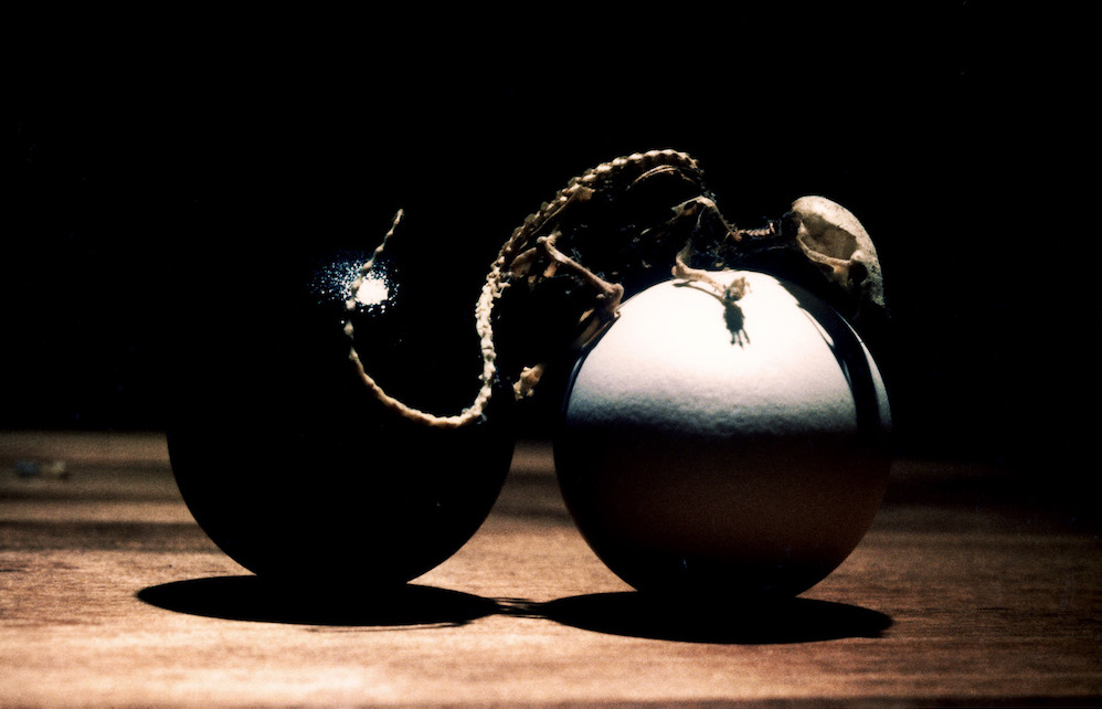 by Francois Desjardins Didn’t have anything for this challenge until Jeanne reminded me of something I did a long time ago! We had a very old country house which we were renovating and inside the walls, we found all kinds of things of course, and one mouse skeleton! Well, as I was teaching photography and doing the odd show, I had printed the slide on Cibachrome: two eggs seen from the end, one painted black, with the mouse bones on top! So now, 40 years later, I used it to produce another interpretation. Still a dead mouse!