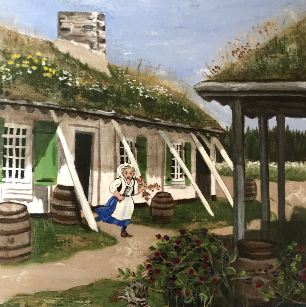 The farmhouse is based on a photo I took at Fort Louisburg in Nova Scotia. I loved the sod roof, so pretty. The woman was an animator at the Fort.