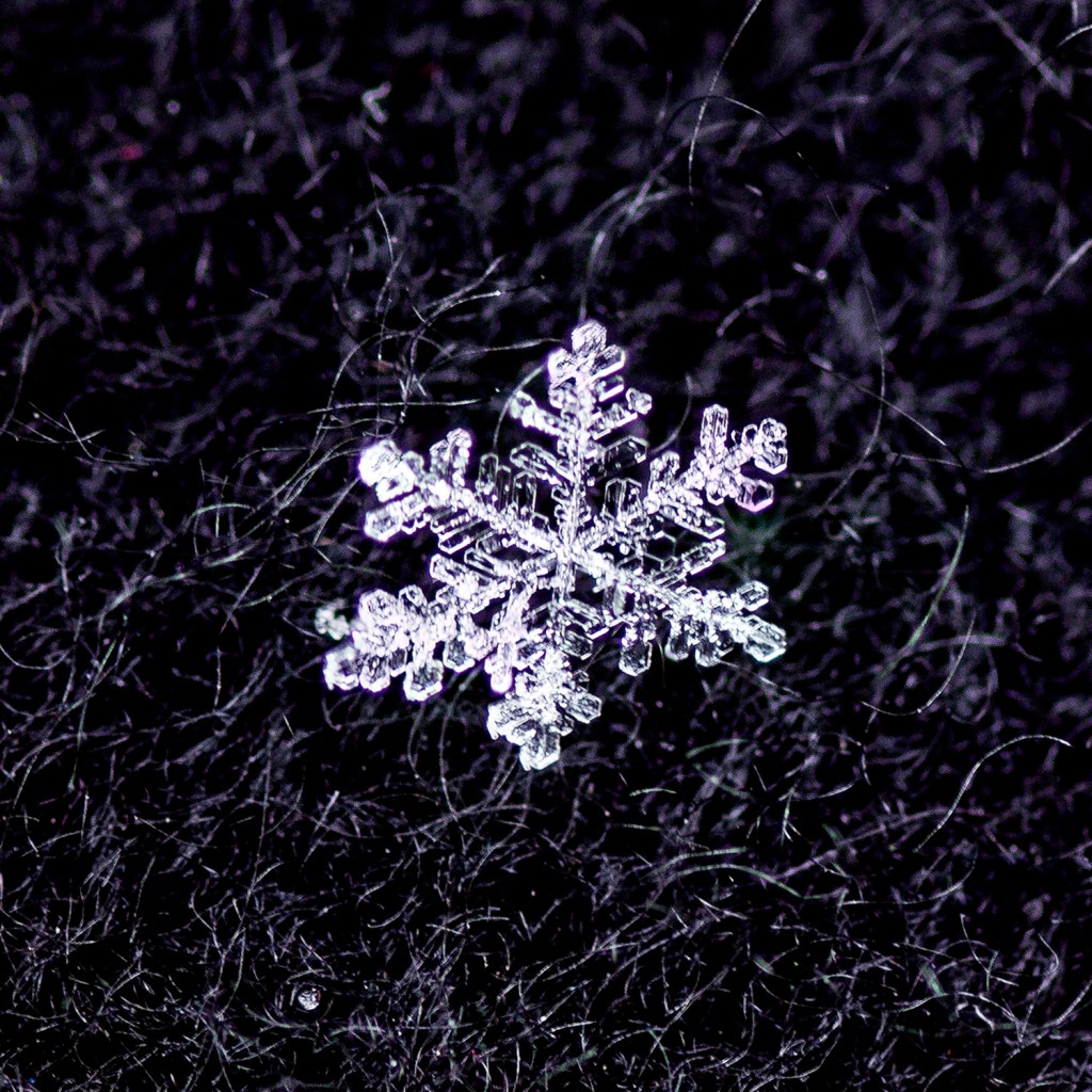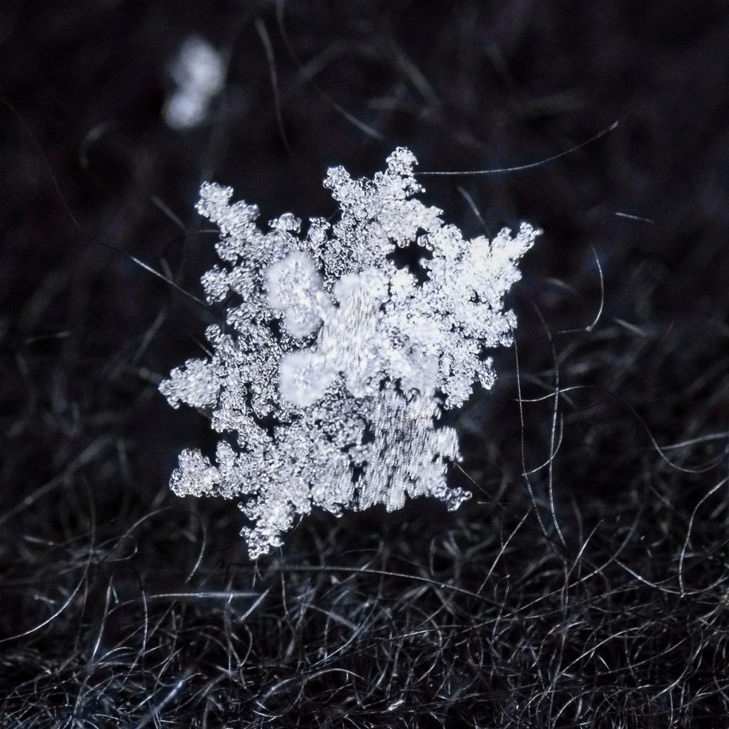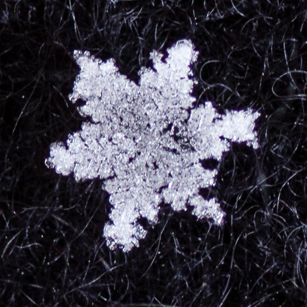 Yvonne sent me a NYTimes article on photographing snowflakes. I don’t use such hi-tech gear or grow my own snowflakes.  Using simple gear, I collected a few flakes from the sky–not from a snowdrift or surface–on suitably cold days. Yes, this was a multiple day project.