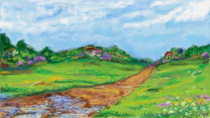 [A week later, Ed.] I just learned a new technique with the Fresh paint app. It was done with the watercolour and pencil brushes.  I  call it Road  After the Rain.  This one took me all afternoon.