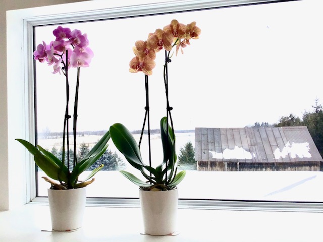 Orchids on the window ledge looking out over the barn and fields from our Dunvegan farmhouse. Love the beauty of the orchids against the stark white of the winter snow.