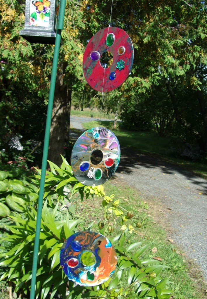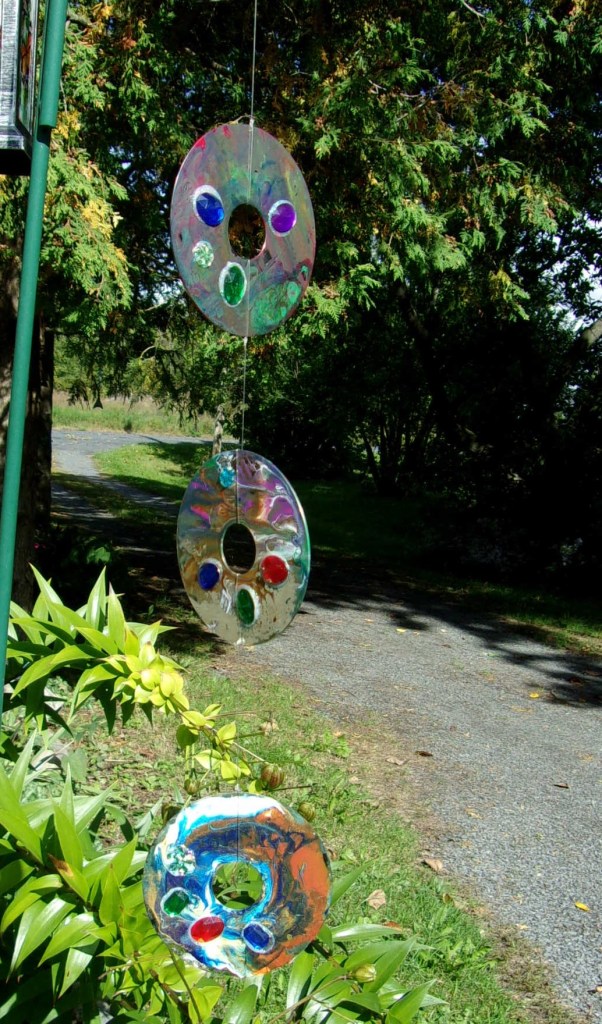 Each disc is about 4 inches in diameter. After they were dry I glued on some “jewels” and strung them together with fishing line. When hanging outside they twirl and spin and and flash, partially mirroring their surroundings.