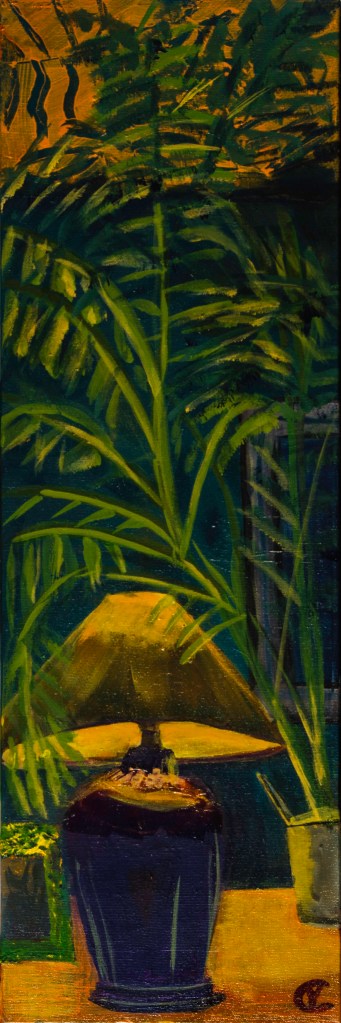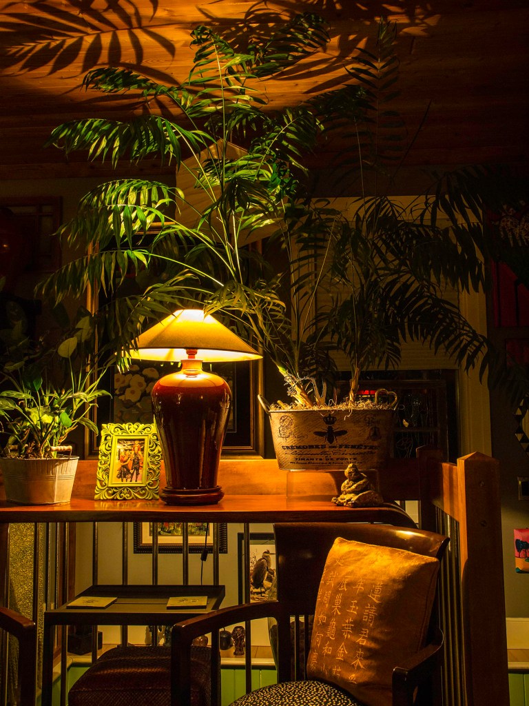 The lamp sends a warm ambient glow through the foliage, creating interesting shadows on the wood panel ceiling. Having created a cozy corner, Milo made a series of cozy photos, this was the coziest.