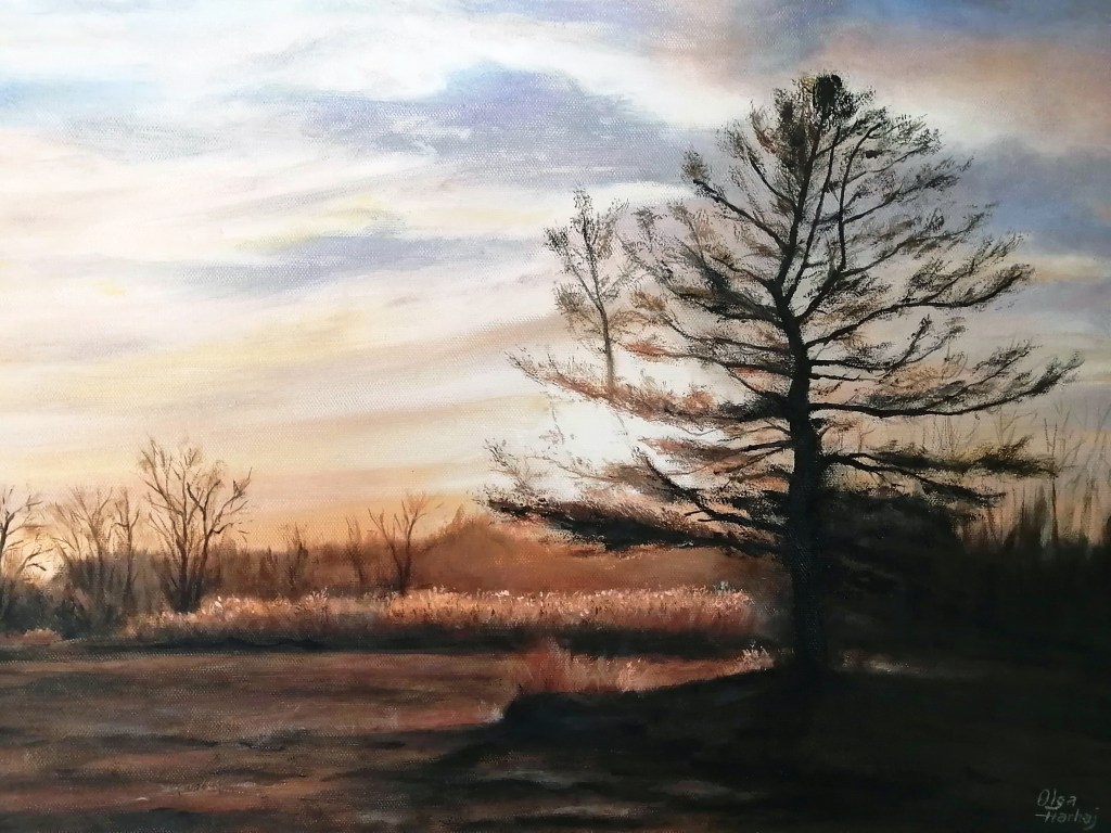I recently finished this oil painting of a local scene here in South Lancaster. I took this sunset picture on one of my walks in the summer of 2020 and put it aside. It’s located on an empty lot on Hwy 2 that may be developed in the next few years. Decided it was time to paint it and title it The Lone Pine.