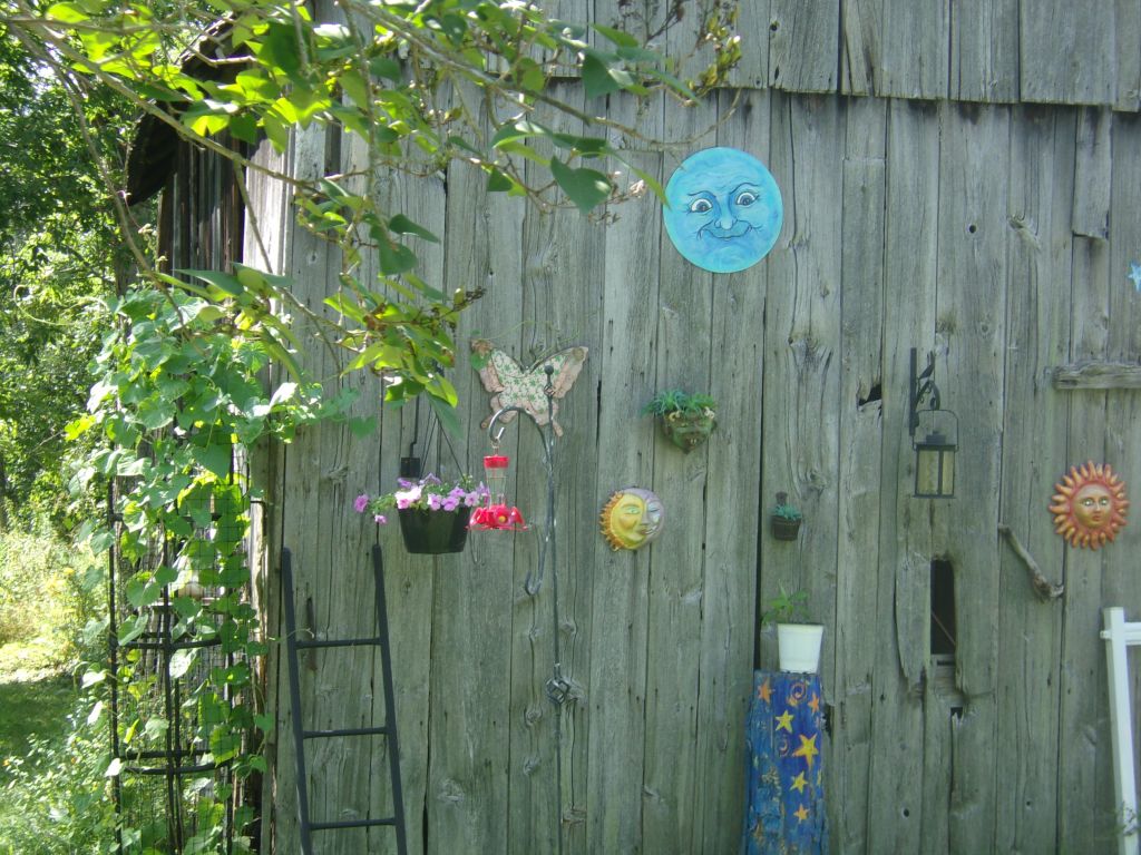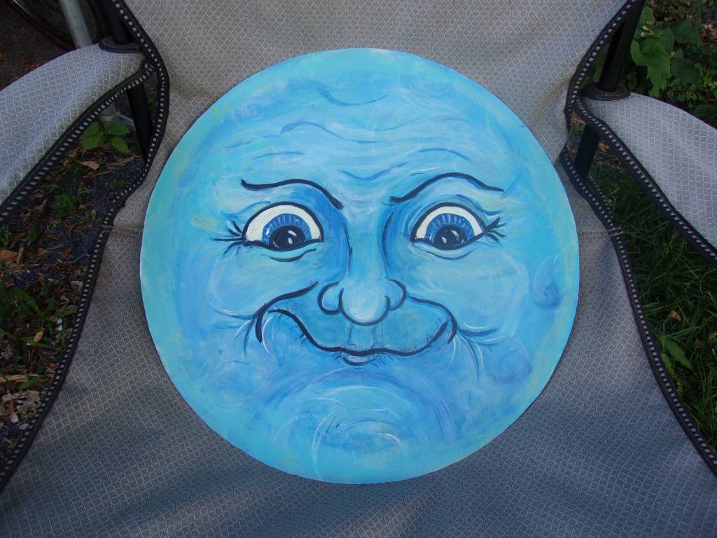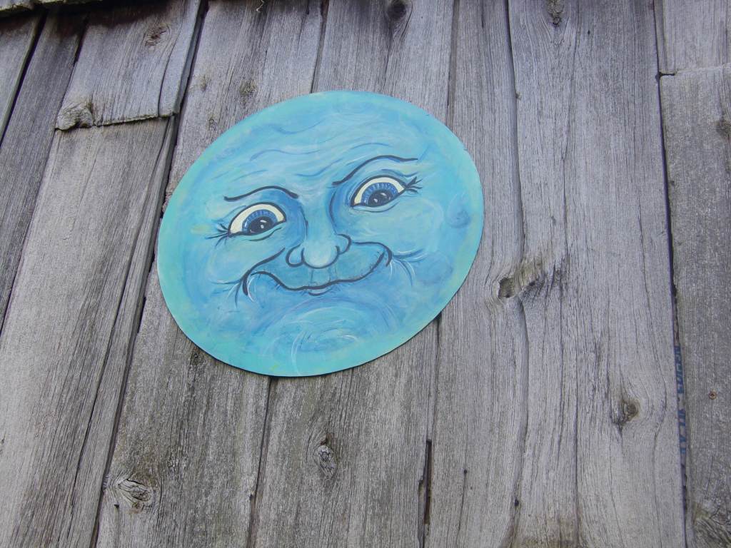 I found a circular piece of galvanized steel in the barn and decided to paint a “Man in the Moon” for my barn wall. He looks a bit (?) demented. That is intentional, as anyone who has ever worked in a bar or a pub or with the police, knows how crazy things can get during a full moon!