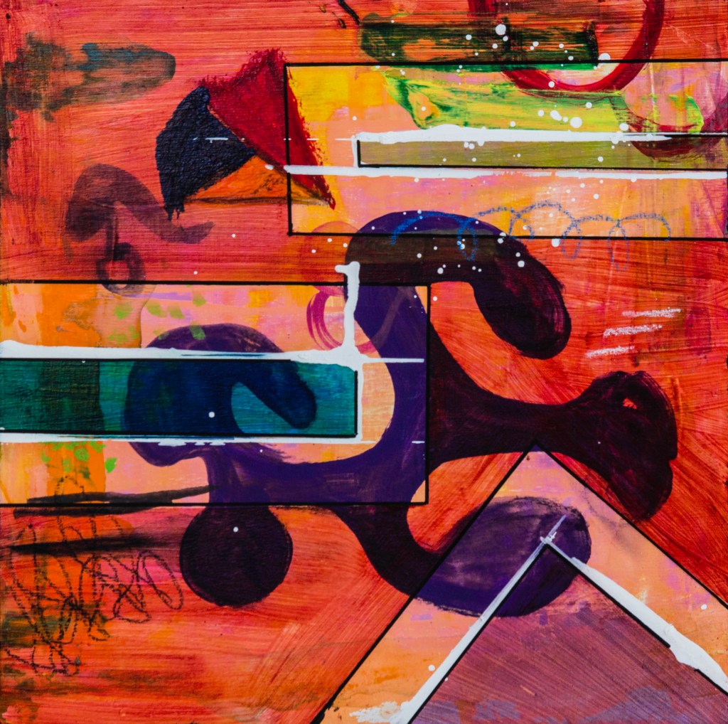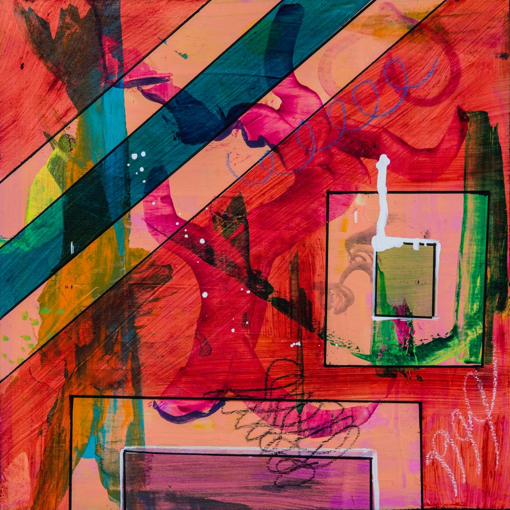 WOW!…What is happening?…The colours are amazing…vibrant, dark…angular shapes complimented by loose flowing yet, dark depths of colour…it’s amazing! A story must be behind such a masterpiece. I luv it!Sent from Samsung tablet