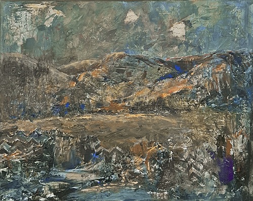 I took ripped collage papers I had created myself and using gel medium, pasted them hither thither over the whole canvas.  Then I used mars black and zinc (transparent) white and a palette knife and applied without any specific concept in mind other than that I wanted to do an abstract-y landscape. The hope is to cover up much and have collage poke through here and there for layers of interest.