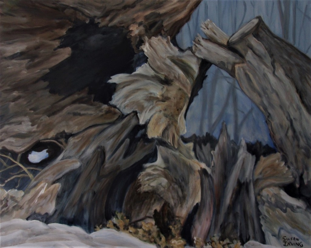 My inspiration was a photo I took while walking out in the woods in Charlottenburg Park. The remains of a long dead tree looked very lyrical to me and I found it an interesting challenge to paint.