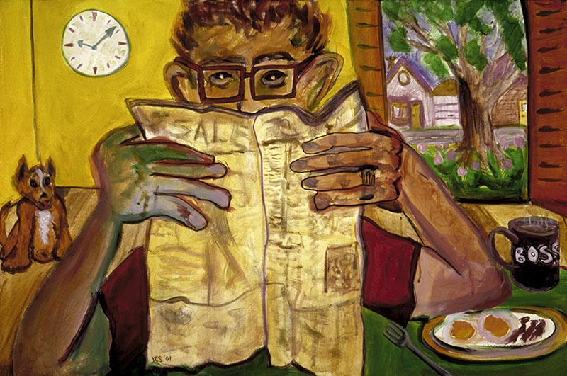 This work was started three years ago, on a piece of unstretched canvas. I painted two blue eggs in yellow egg cups with chicken feet. No idea why. Months later I painted a landscape in the background. I kept working on the chicken feet of the egg cups, but could never quite get them quite right.