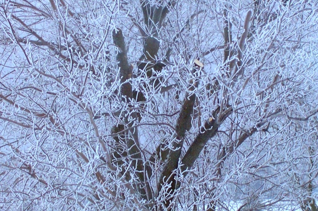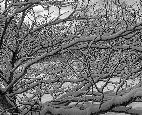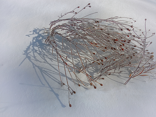 I really love the sunrises this month. They don’t last long. I tried to capture it here, as well as the fields that still show the tilled mounds covered with a pristine blanket of snow. The view from the evergreen branch is the contrast of snow close-up with snow far away.