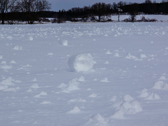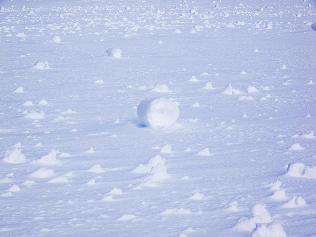 “Also known as “snow bales”, “wind snowballs”, or “snow doughnuts”, snow rollers are formed when the wind pushes fresh, wetter snow along the ground. The end result is a hollow cylinder of snow that can vary in size.