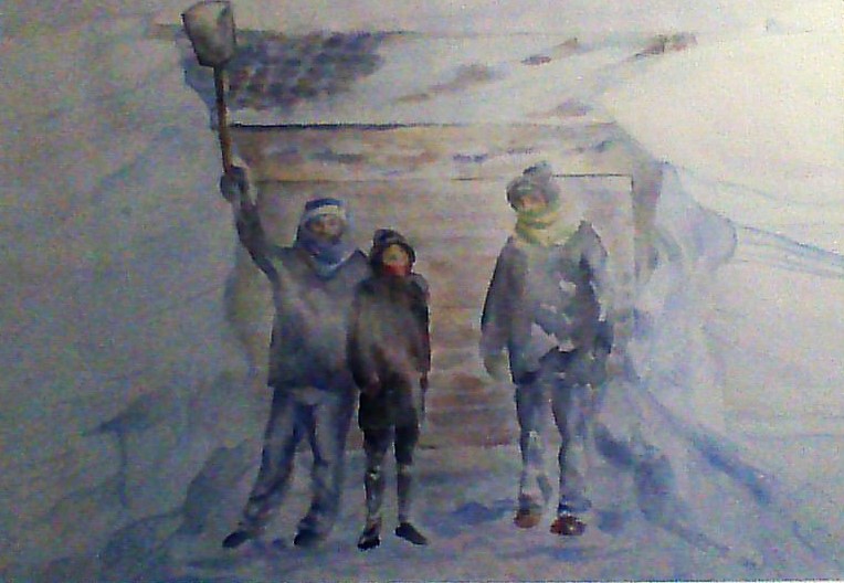 Our first winter storm in PEI. It took 3 days to dig out. The drifts were up to the second-storey windows. Pictured here are my husband, Mike, daughter, Tansy and our neighbour, Ivan, having at last dug out the garage. Notice the drift height at the top of the shovel.