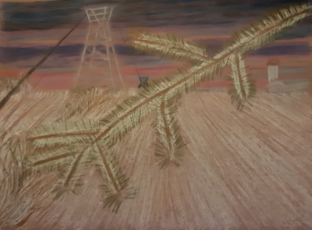 by Kerry Herwynen McIntosh This is a quick acrylic sketch of the pine tree across the street. The property is for sale now and I know that, when it’s sold, both the abandoned building and that tree will be coming down.