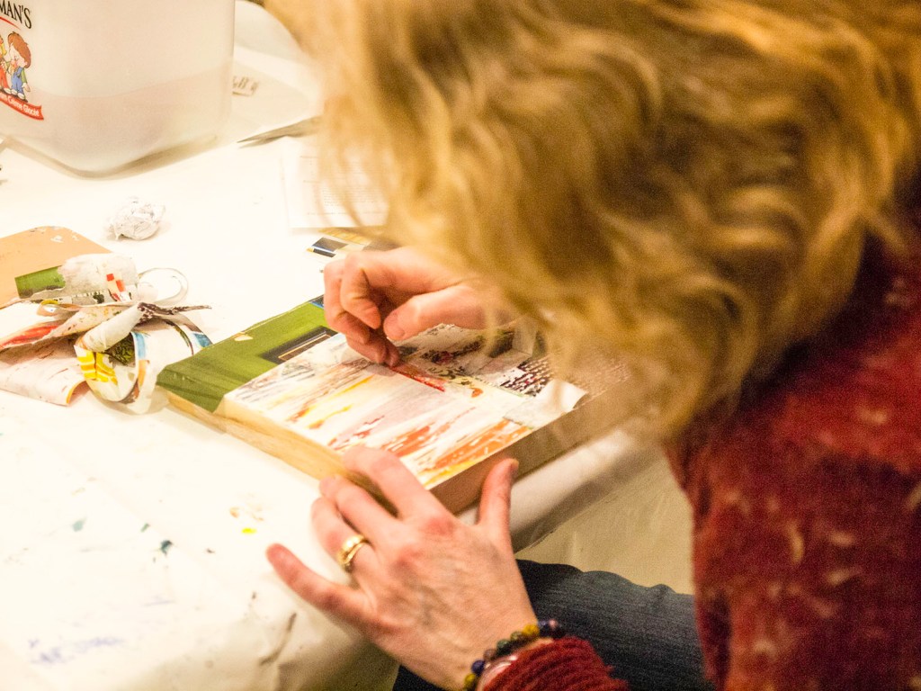 It was a sticky, splashy, learning op interspersed with conversation, laughter, coffee and treats. The leaders had prepped and gessoed the twenty-five 8″-square boards so attendees could dive directly into applying their chosen images.