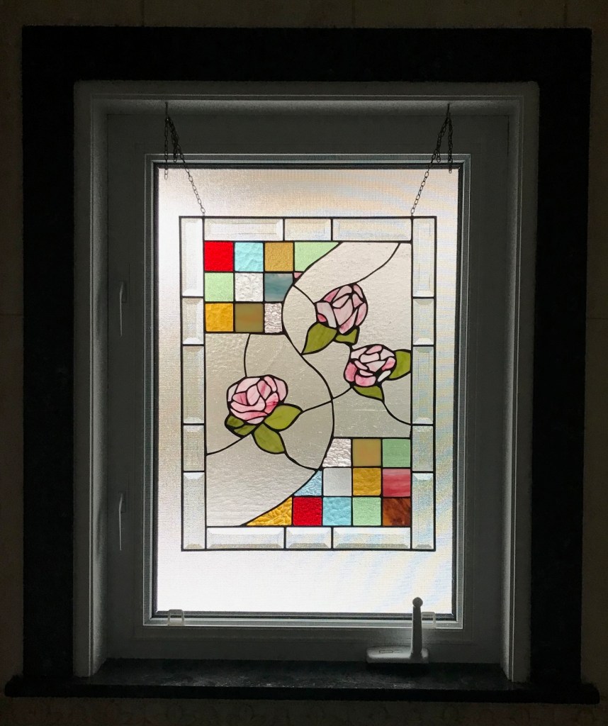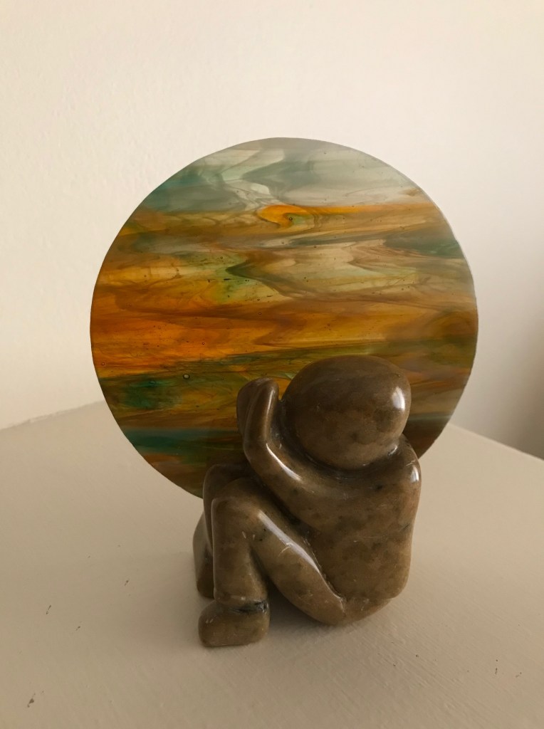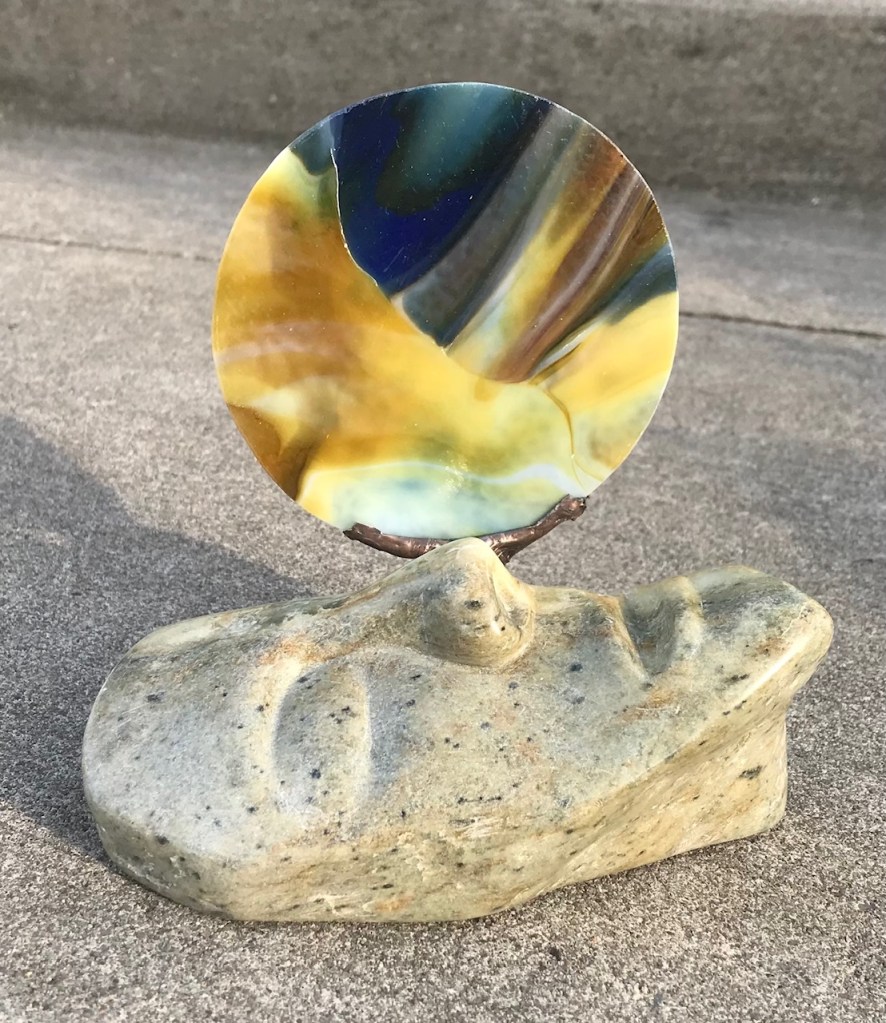 All stained glass I make are my own designs. The paintings are inspired by snapshots of my life and the soapstone sculptures are reflective of lived emotions.
