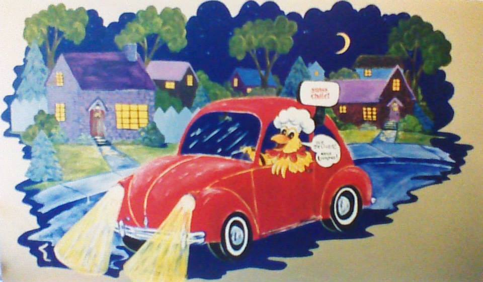 The second is a mural I painted for a Swiss Chalet in Ottawa,  back sometime in the 1990’s before they got quite so corporate, and allowed such things. It was mounted at the take-out counter, on a 4 x 8 ft  sheet of plywood, painted in acrylics. The manager at that time was a very personable and entertaining fellow who drove a red Volkswagen.