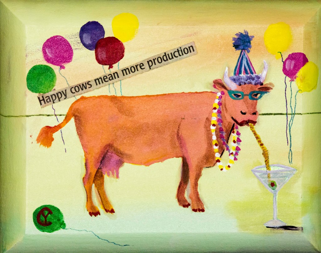 I also have a fondness for cows & have done several paintings of them over the years. The one below developed from a line in the local paper, conveniently affixed to the work. Happy cows mean more production. I tried to show what would make me happy if I were a bovine. Partay!