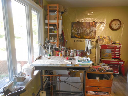 The canvas hanging on the wall in the image showing my art table is a Posterjack image on canvas that didn’t turn out as expected. I am in the process of covering it over with whatever leftover paints I have on my palette at end of day. It has no current intent but I am looking forward to some fun play as it grows up.  The red set of drawers is my husband’s repurposed tool chest.  I think he’d be happy with it’s second life.
