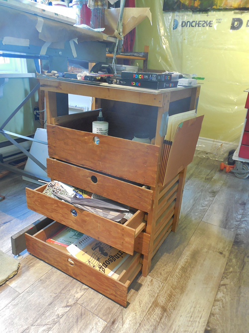 The table with drawers displaying various supplies is a repurposed beehive, which serves me well for the clutter of supplies I like close to hand.