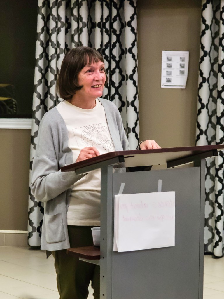 Thank you all for coming out this evening. I want to start by introducing our board members: Yvonne Callaway, Vice President, Treasurer, Collectif Creativity curator and Wow Coordinator (among other things), Membership; Lynne Ayers, our incredibly efficient Secretary; Elaine Delves, Hospitality Director who keeps us in coffee and goodies; Kerry McIntosh, Susan Irving, and Laura Peck, all directors at large who take over any task when needed. I’m assuming you all know me, Bobi, President, and Trouble Shooter (or troublemaker, depending on the circumstance). Together, we come up with ideas, discuss ideas others present to us, and hammer out all the gory details.