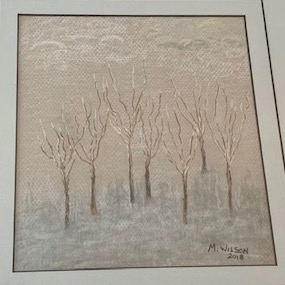This was a frozen morning, travelling north on the bridge from Hawkesbury to Grenville. I saw the tree tops on the island just to the northwest, shimmering above the frozen fog on the Ottawa River.  It is colour pencil, on paper, from my head.