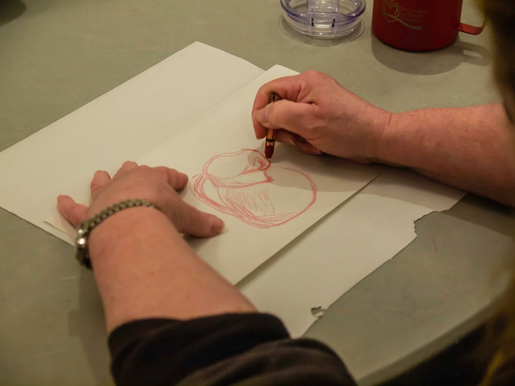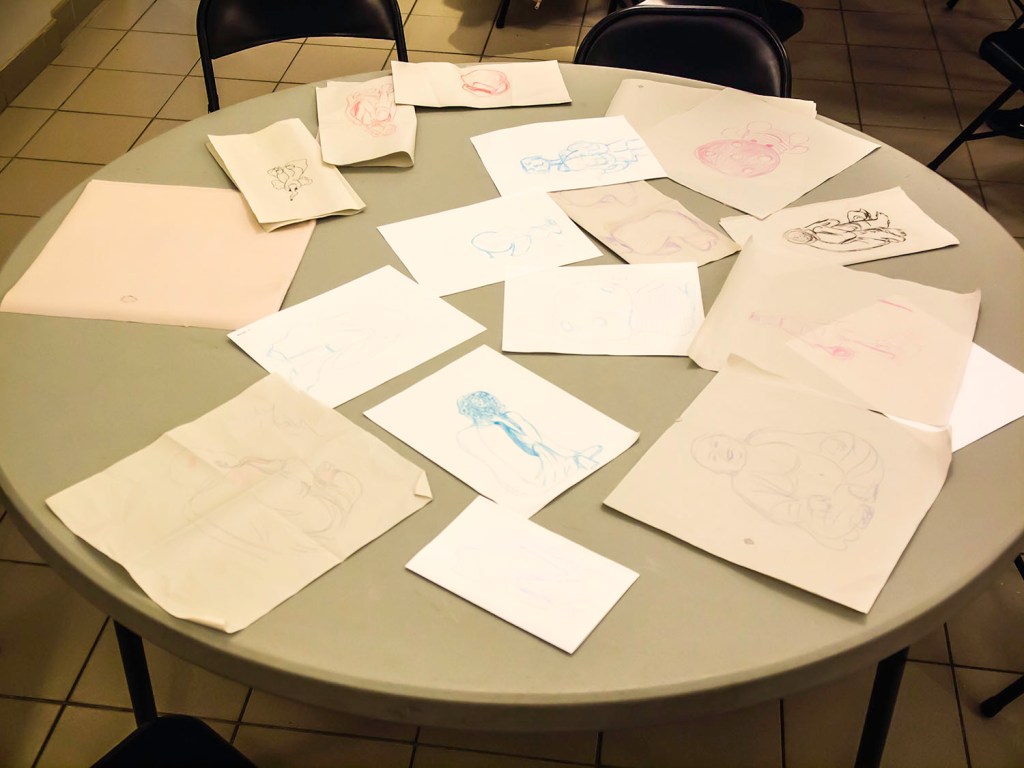 Each table had a designated coverer/revealer, too. Step 1 we’d look at the subject for 5 seconds, then cover, set timer for 30 seconds & draw subjects from memory.