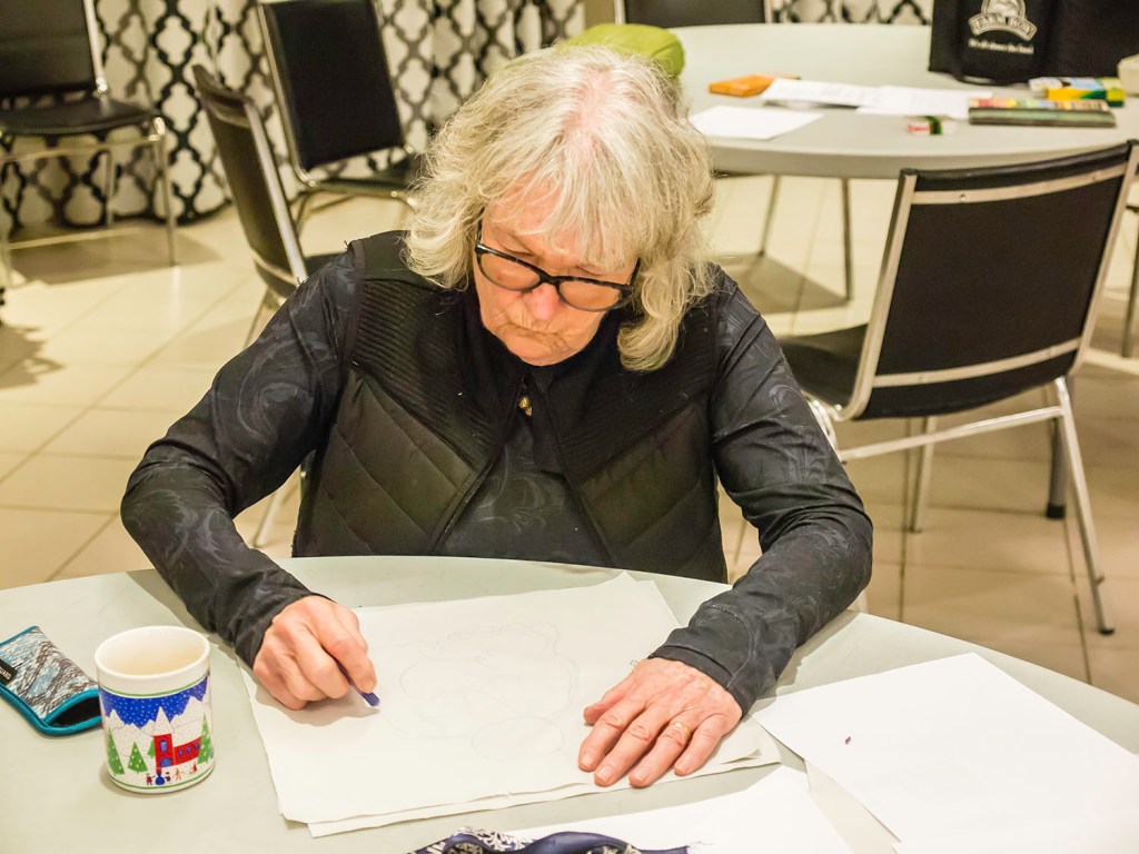 This was originally a session on Sketchbook Revival (online initiative by Karen Abend) entitled Be Free & Have Fun … with Lucia Leyfield (terrific artist in the UK). Member Alison Hall suggested the activity and then ably led group of four tables through three rounds. She was also the timer.