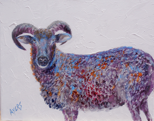 Sheep’s wool built up with dabs of varying colours as well as some impasto in the white background for interest.