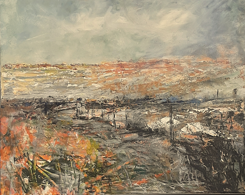Scratching and layering [insert 146] On the Moor Where You Wander, mixed media, 16″ x 20″ on canvas