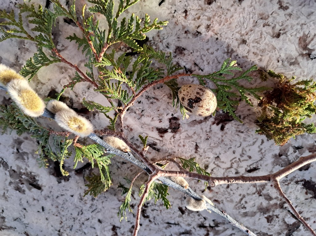 One large pine shelf welcomed the seasonal homemade decorations. Nora had to extend her right arm to reach the handcrafted Christmas items, preciously collected year after year. Now, she was half-way through when something tickled her nose. One tiny soft silky ball. No, two. Three. Not that tiny. Carefully, she brought the twig to her upper lip, so she could relish in the delicate, exquisite texture and the sweet, tender smell of pussy willow. Not any pussy willow. She stepped back to behold what her left hand had seized. A cordial wooden Easter bunny offering her branches of cedar nicely tied to the first signs of spring. The flexible golden cedar contrasted with the strong dark pussy willow. Nora’s palms caressed the colorful cotton ribbon: dancing miniature red hearts, green stems and yellow flowers finely embroidered gave it a unique feel. At this moment, the rugged skilled tanned hands who brought this delightful arrangement from the Alps to Canada, came back in her mind and her soul. “Palmbuschen” had said Anna, almost five years ago. Since then, the two friends discovered that they had a lot more in common.