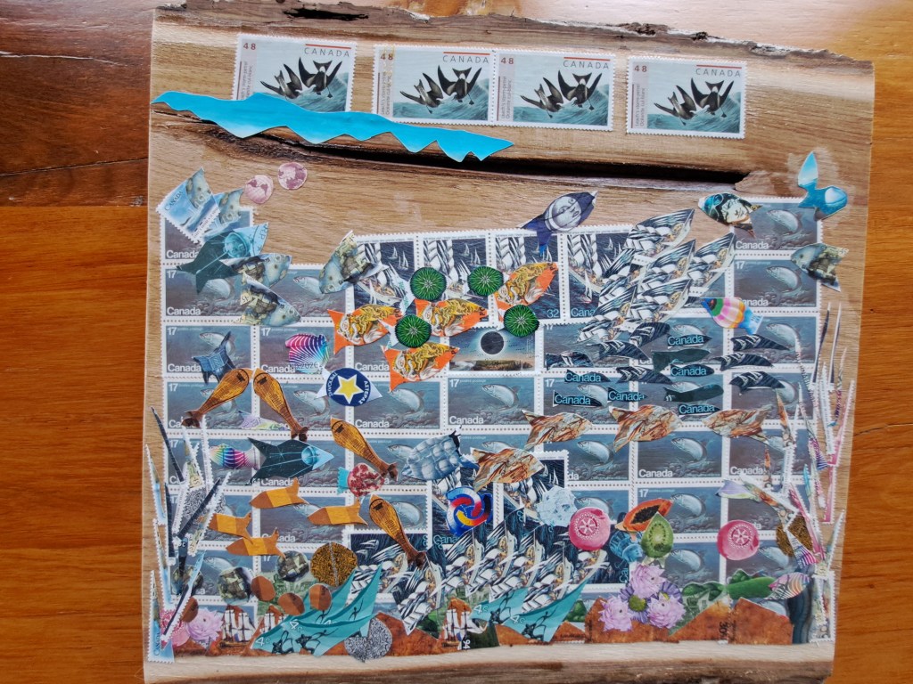That kept me thinking for a few days. Then I spent some time with my stamps, getting them out of their jars & slips. This is when I saw beyond the stamps. Well not really beyond, more like inside the stamps. Colours & patterns. I had in front of me: Ocean Canada – that was in the Big Show. And another one called Big Fish.  As I started to sort, cut & adjust more stamps on the Ocean, I enjoyed diving deeper. In less than two hours, Ocean Canada became Ocean Before Plastic. At the same time, I noticed my left hand automatically almost put some cuttings aside on Big Fish.