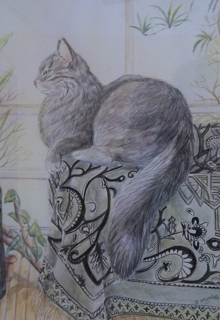 This is a portrait of one of my cats, done in watercolour pencils on paper.  She passed away many years ago. Her name was “Fluffer”. She was found with 4 kittens. She had been neglected in a horse barn and was unwanted and very matted.