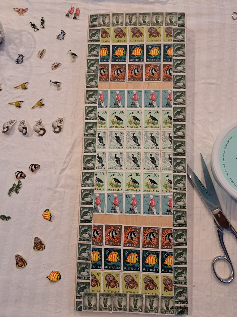 The background is created with fluid acrylics spilled out of shovels about 4 x 6″.  The various shades were poured into each shovel and tipped onto the canvas while pulling it across the canvas. Very  fun! Took many weeks for the whole thing.