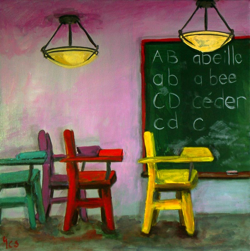 By Yvonne Callaway A colourful classroom with the beginnings of the alphabet – and wordplay – on the green board.