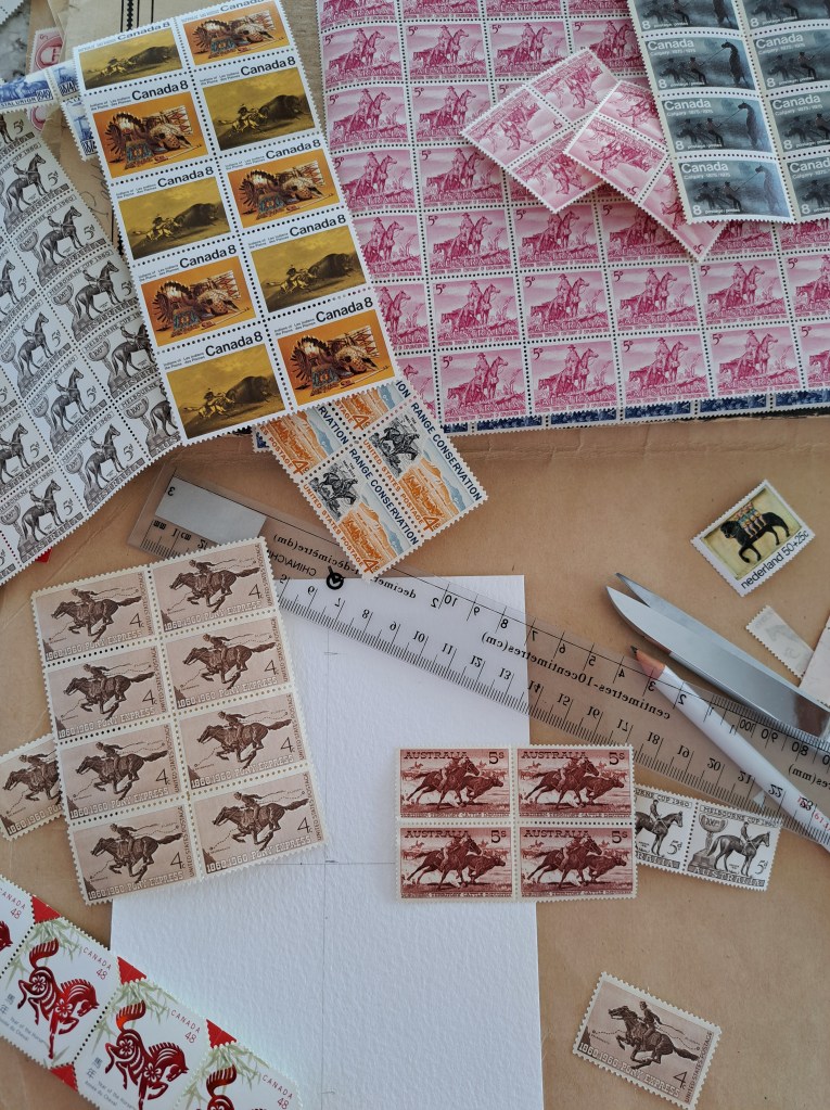 Dans mes trésors de timbres, j’avais mis de côté quelques planches et quelques isolés représentant des chevaux.