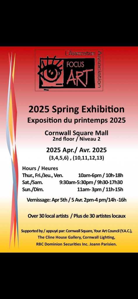Another opportunity to view the works of local artists (including several Collectif members). The annual spring exhibition opens this week in Cornwall Square, 2nd floor near the food court.