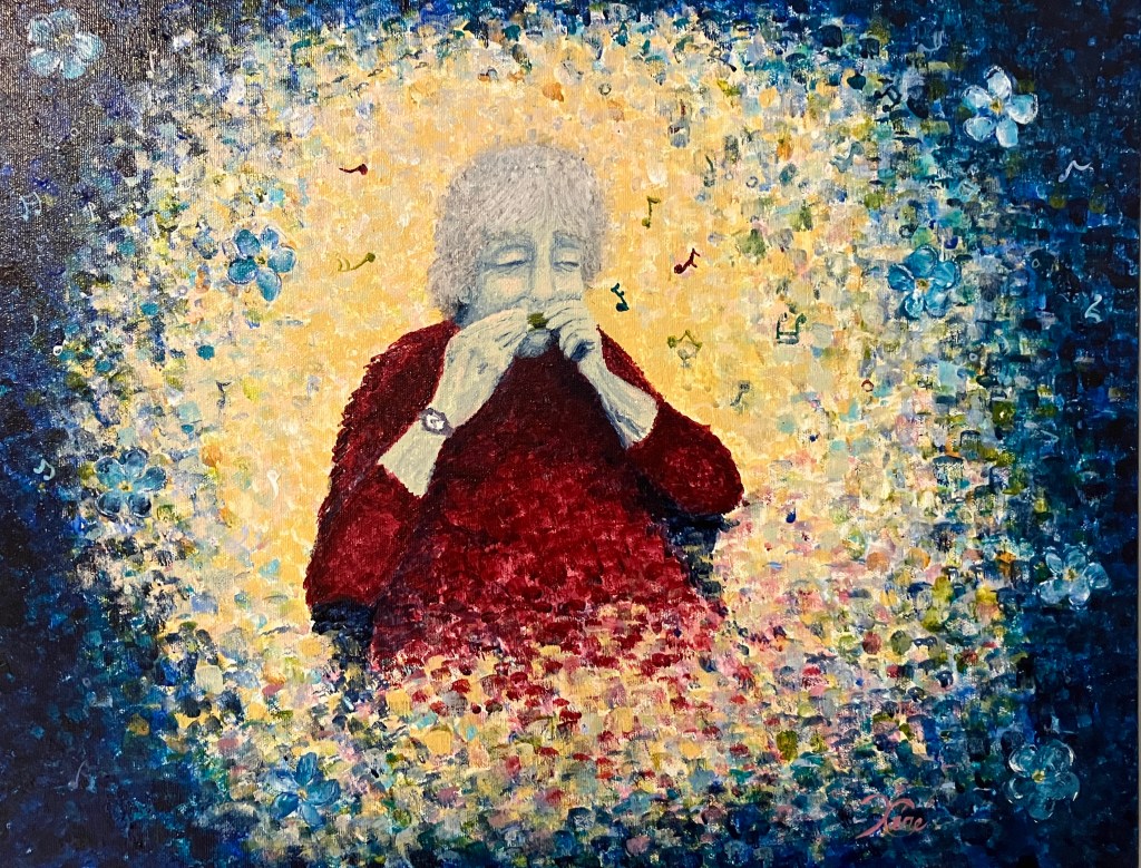 By Hélène Ceré I made this painting in memory of my mother who passed during the pandemic in 2020. My Mom was in a long term care facility and was suffering from Alzheimers. During one of our visits, she insisted on having an harmonica. She would say, “Where is my harmonica?” In all my life, I never saw or heard her play, never knew she did!