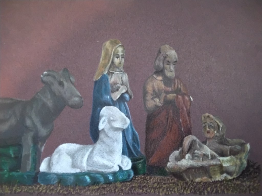 By Magdelene van den Oetelaar This is a memory of my parent’s Christmas nativity set. It is coloured pencils. It was done this past winter.