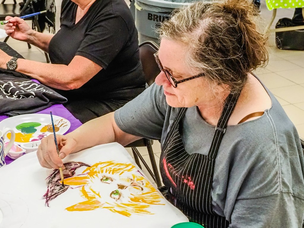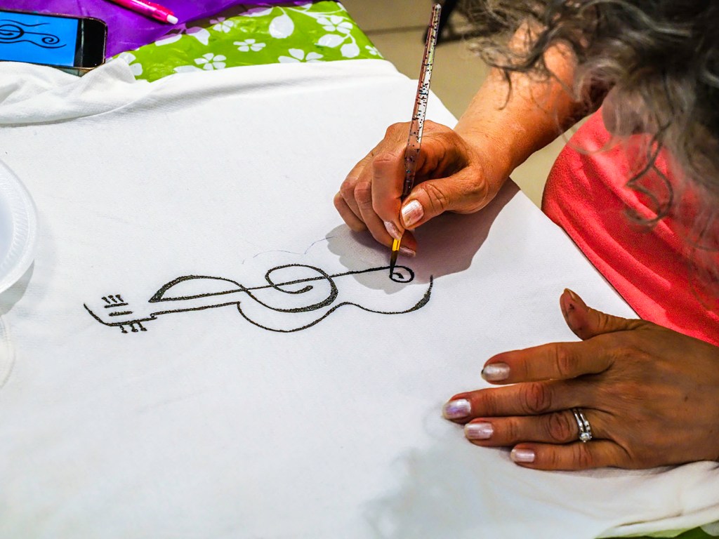It was a very full house for the Wednesday 11June Coffee House, featuring instruction & supplies for T-shirt painting. It didn’t HAVE to be a T-shirt.  As was clarified by Bobi, “You can paint a peace sign on a leg of your jeans, a dolphin on your bathing suit, a tank on your tank top . . . whatever you want!” She and Susan Irving guided the 21 attendees through the process – it was much easier than we’d thought!