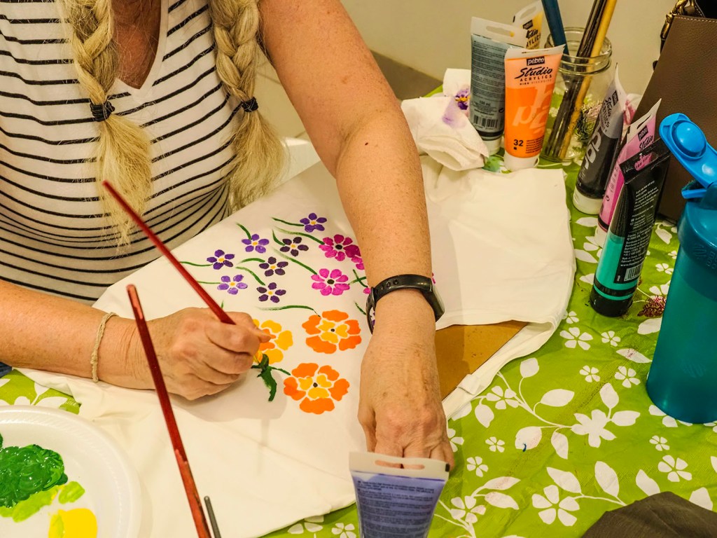 From 11 to over 80 years old, most of the participants had a precise idea of what they wanted to accomplish that night: bring life to a T-shirt, give a jean jacket more personality, polka-dotting a tote bag or, on the spot, add some poetry to a plain shirt’s collar with a daisy.