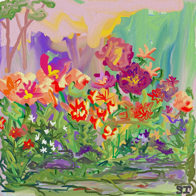 I have been working on this Fresh Paint (digital) painting, Flower Garden, on and off for a few weeks now. One can either “mix” the colours on the canvas or on the palette. The canvas can also be “dried”, so the colours stop mixing and more can be added later without any smudging.