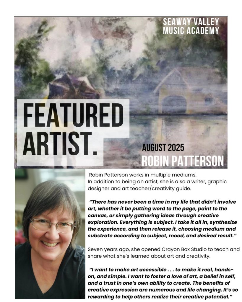 Member Robin Patterson’s work is hanging at Seaway Valley Music Academy at 707 Rosemount Avenue, Unit 2, in Cornwall until Thursday, August 28.