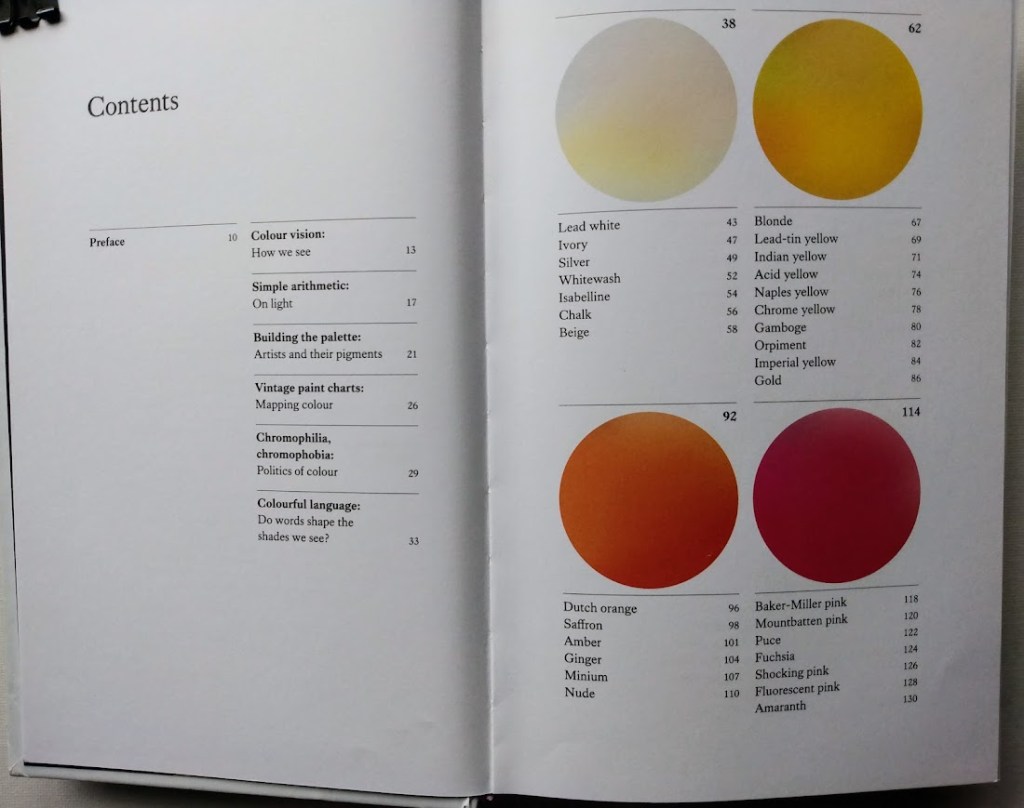 The main body of the book is essentially organized as a series of short essays on the broad categories of whites, yellows, reds, blues, greens, and blacks, and, within the categories, the author examines a vast array of 75 individual colours of varying shades, hues and tints. These short essays of two to three pages (which sometimes sent me off to explore and gather additional information) offer a unique perspective on how colours have influenced art, fashion, politics, and more throughout history.