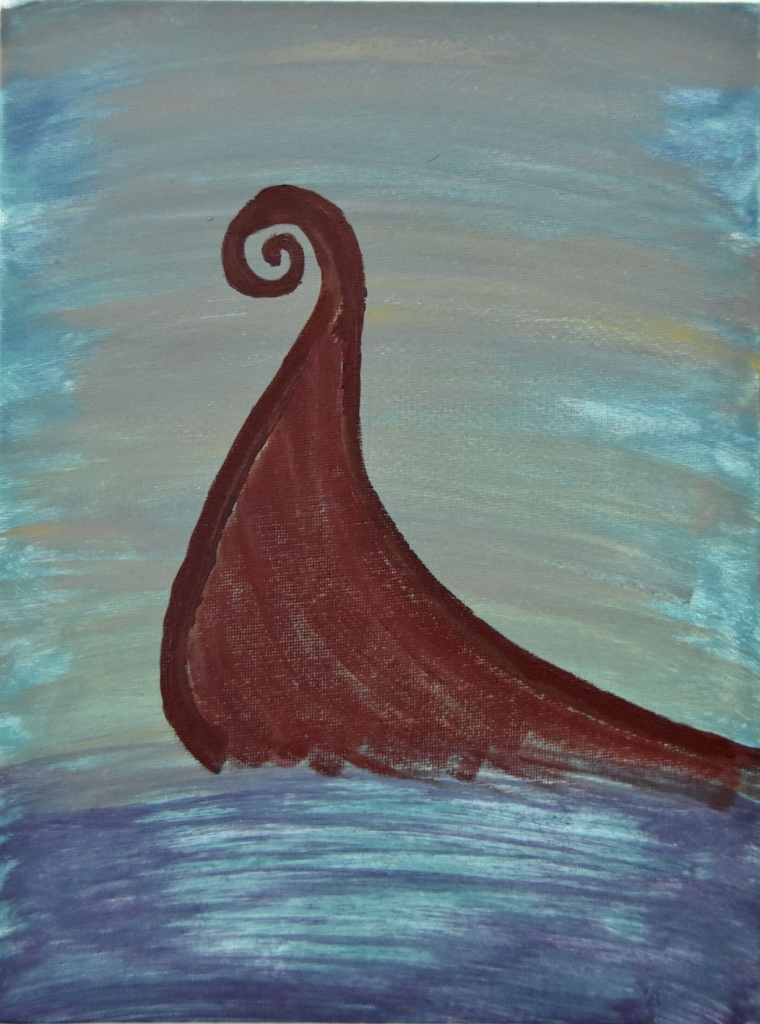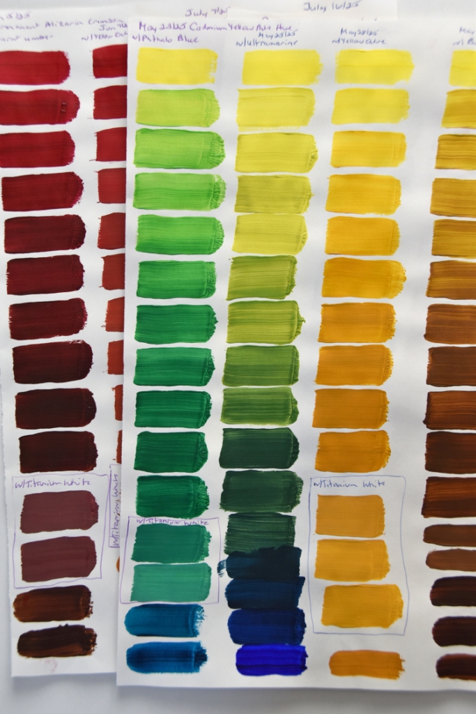 My inner painter unleashed, I continued painting after the sessions ended. I began by experimenting with colour, blending each of the eight paints with each of the others in turn to see the array of colours they produced. Eight colours (well, six colours plus black and white) produce an amazing variety of colours, tints, and shades. (Those experiments later provided me with handy reference sheets for when I’m seeking a specific colour.)