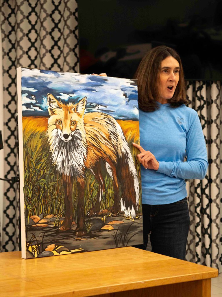 Michelle O’Connor is known for her detailed landscapes. Yet when a student brought her a photo of a fox, Michelle was compelled to create a large portrait in a looser style imposed on a different background.